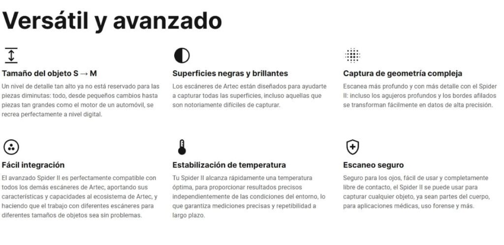 Escáner 3D portátil Artec Spider II de ultra alta resolución para capturar objetos pequeños y medianos con full color. Digitaliza geometrías complejas, bordes y detalles finos con precisión y resolución de hasta 0,05 mm, escaneando de forma rápida e intuitiva sin targets (seguimiento por color y geometría). Ideal para ingeniería inversa, inspección de calidad, escaneo a CAD, prototipado y gemelos digitales.