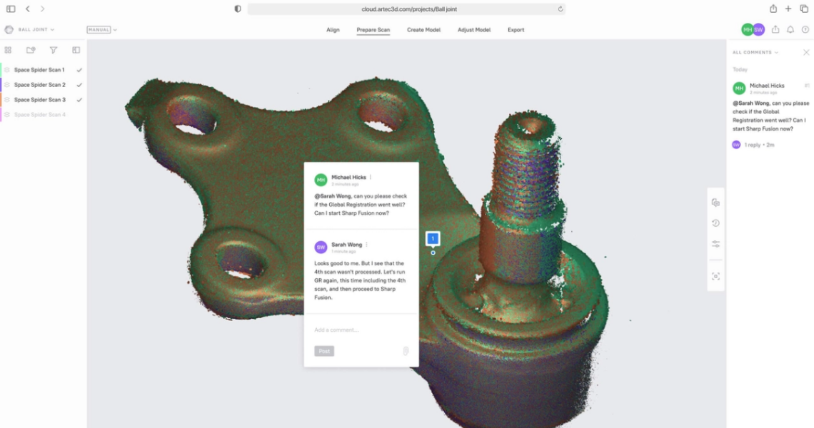 Con la función de escaneo en la nube de ARTEC Leo, ya no estás limitado por la ubicación ni por el hardware. Desde cualquier parte del mundo, los miembros del equipo pueden colaborar en el mismo proyecto directamente desde su navegador. Los escaneos pueden procesarse de forma automática mientras realizas otras tareas, y es posible ejecutar proyectos paralelos simultáneamente, optimizando tiempo y recursos.